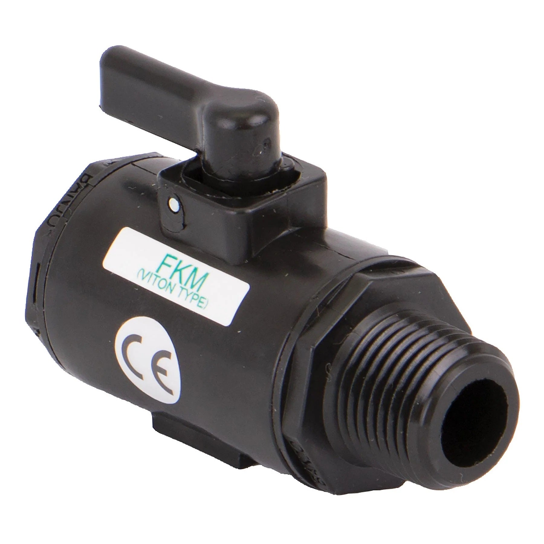 90° rotating handle. Maximum operating pressure 300 psi Precision molded polypropylene is reinforced with fiberglass for additional strength. Standard FKM seats and O-rings.